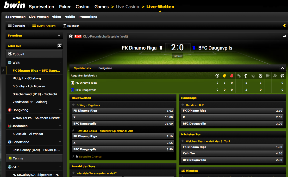Viele Sportwettspieler stehen bei ihrer Wette für gewöhnlich vor einem großen Problem. Auch wenn der Sieger der Begegnung im Vorwege anhand der Auswertung von Statistiken und den jeweiligen Ligapositionen eindeutig erscheint, so kann während einer Begegnung stets sehr viel Unerwartetes geschehen. Sei es ein überraschender Platzverweis oder Fehler im Fußball, der die Stärkenverhältnisse der Begegnung gänzlich auf den Kopf stellt oder ein überraschend starker Tag eines Außenseiters beim Tennis – nicht selten sagt sich der Spieler den Satz: „Hätte ich es vorher gewusst oder könnte ich noch eingreifen, dann wäre meine Wette anders verlaufen“. Das Schöne bei dem Wettanbieter bwin ist, dass der Spieler eben jene Chance hat, die Wette trotz überraschender Ereignisse dennoch zu gewinnen. Das Prinzip der Livewette macht dies möglich, was letztlich auch den großen Vorteil einer Livewette ausmacht.